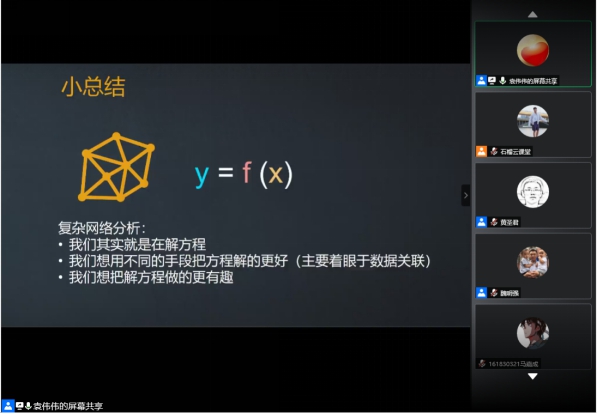 最后,袁伟伟以生动幽默的语言带领大家进入复杂网络的奇妙世界。她从“六度空间”切入,引出复杂网络的概念,并介绍了网络数据挖掘在脑网络、药物网络、社交网络等方面的应用。她指出,复杂网络结构刻画事件更全面,非常适用于节点信息不丰富的场景。