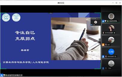 随后,秦瑞哲以“专注自己,克服弱点”为主题进行分享,建议同学们一是要根据特长和兴趣明确自身目标;二是要努力学习专业基础知识,保持良好的成绩;三是要发挥专长潜质,弥补学习中的短板,通过学科竞赛、论文、专利等提高自身的能力水平。
