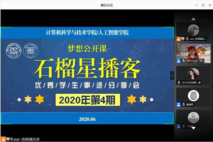 6月21日晚,计算机科学与技术学院/人工智能学院成功举办第四期“石榴星播客”优秀学生事迹分享会,学院2018届本科毕业生丁强刚和2020届本科生秦瑞哲、毛心怡与100余名本科生云端相聚,分享了专业竞赛、科技创新等方面的个人成长经历和感悟。本次分享会由2018级本科生辅导员胡朋主持。