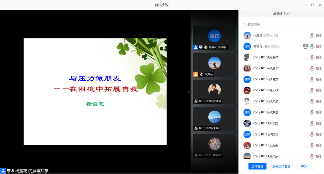 为缓解疫情带来的生活和学习压力,帮助学生更好地调节情绪、应对挑战,6月16日晚,机电学院邀请校心理健康教育中心主任杨雪花老师,通过腾讯会议开展“与压力做朋友——在困境中拓展自我”线上心理健康教育专题讲座,辅导员代澔丛、于子洋以及200余名学生参加了此次活动。