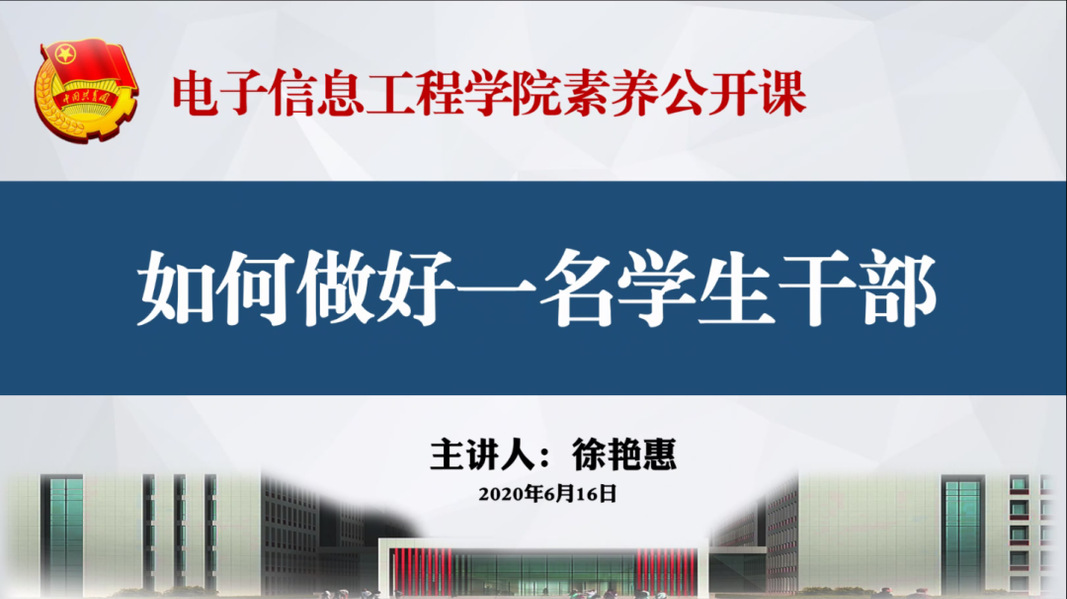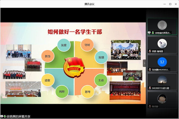 2020年6月16日,电子信息工程学院于腾讯会议开展“如何做好一名学生干部”主题素养公开课。我院团委书记徐艳惠老师首先表达了对新一届学生组织学生干部的热烈欢迎,其次就上一学年团学工作的成绩、不足、思考等方面与大家进行了分享交流,对学生干部应该具备的素质能力以及如何做好一名学生干部进行了生动的阐述,电子信息工程学院71名学生干部参与此次活动。