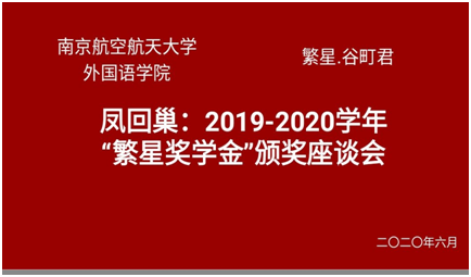 6月22日下午,外国语学院举行 “凤回巢”校友说暨“繁星奖学金”线上颁奖座谈会。“繁星奖学金”由“繁星・谷町君”创始人及CEO、外国语学院2007届日语系毕业生刘洋设立。校友刘洋、学院党委副书记梁薇、辅导员彭欢及“繁星奖学金”全体获奖学生参加了本次座谈会。