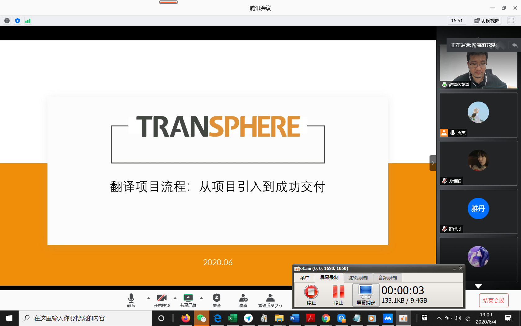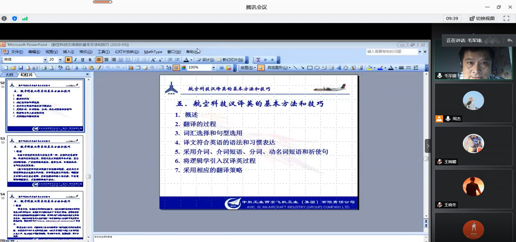 中国航空工业集团有限责任公司翻译系列高级专业技术职务任职资格评审委员会委员、中国翻译协会专家会员、中国航空学会会员、陕西省翻译学会常务理事毛军锋为同学们讲授航空科技英语翻译技巧系列课程。多年积累的实践经验加上深入浅出的授课方式让同学们受益匪浅,对航空英语翻译的学习有了新的启示。之后,舜禹环球通运营总监刘晓诚结合工作案例向同学们解读了翻译项目管理的详细流程及过程中的注意事项,让学生们对翻译工作有了更加全面深入的认识。“工欲善其事,必先利其器”,翻译技术对于翻译效率的提高发挥着重要作用,鲁东大学外国语学院周兴华副教授向同学们详细介绍了CAT的发展及应用, 并推荐了相关的学习资源与方式方法;最后,外院校友丁宁以健康产业翻译为例,分享自己多年的工作和学习经验的同时,并就口译学习和职业发展给学生们给予了建议。