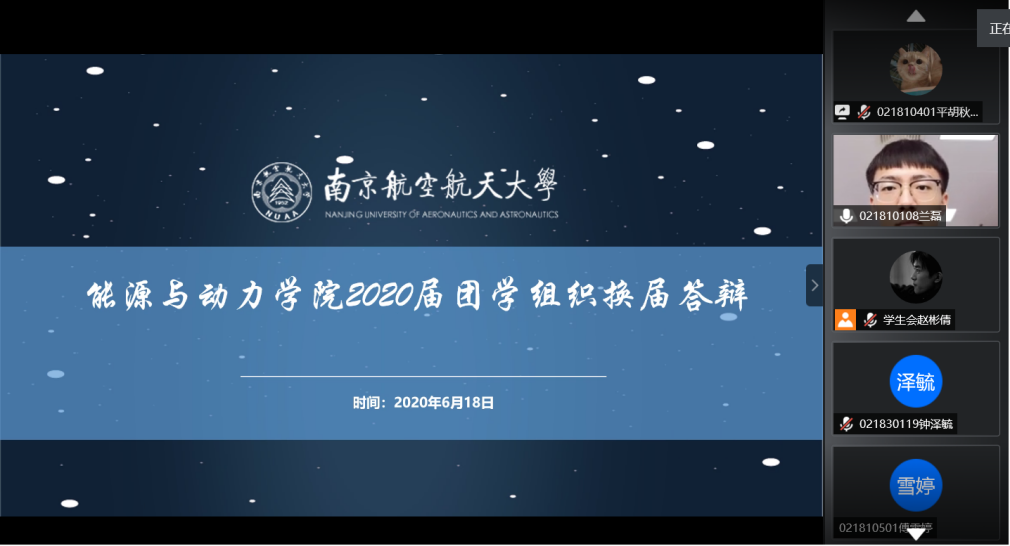 6月18日至21日,能源与动力学院2020届团学组织负责人换届工作如期举行。两轮换届答辩工作均使用“腾讯会议”平台线上进行,能源与动力学院团委、学生会、新媒体、科协和青协五大学生组织的各位候选人就各自竞选职位进行线上答辩。能源与动力学院团委书记张瀚文、各年级辅导员以及学生代表共同参与评审。