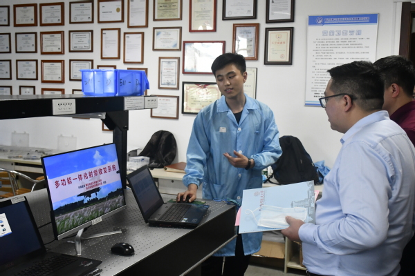 学生代表刘东、王立晗分别介绍了学院无人机天地一体频谱认知智能实验室和微波光子学实验室的最新研究成果。双方就如何具体落实产学合作展开讨论,未来双方将进一步加强合作,发挥好技术与产业优势,不断推进优秀科研项目落地应用,探索电子信息技术在衣食住行等民用领域的新应用。