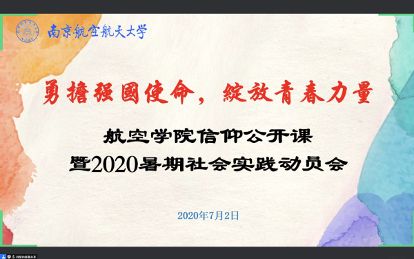 此次航空学院信仰公开课暨2020暑期社会实践动员大会主要是向学生阐述社会实践的开展方式以及主题分类,以此类云端会议的形式调动学生积极参与大学生暑期社会实践活动的积极性,引导广大学生在学思结合、知行合一的实践锻炼中受教育、长才干、做贡献。