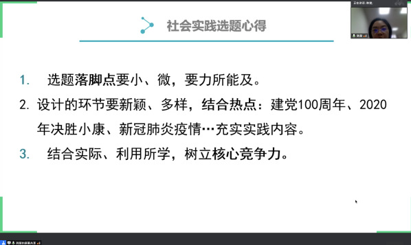 首先,韩楚向大家说明,“因为今年疫情的情况,学校也是不断调整着本次社会实践的方向”,然后就引导学生了解、读懂、体会如何去完成这次不同寻常的社会实践活动。“除了理论的学习,个人实践能力的提升也是十分有意义的。实践过程中除了有效提升个人的能力,还能让我们理解自身所处的国家,所处的社会现在的发展进程和动态。”她向学生讲明了学校开设社会实践这门课程的目的和意义——增长才干,了解国情。这门为期3年的必修课,前两年以学生自主的开展为主,而大三以专业实习为主,由学院团委进行相关的打分和记录。