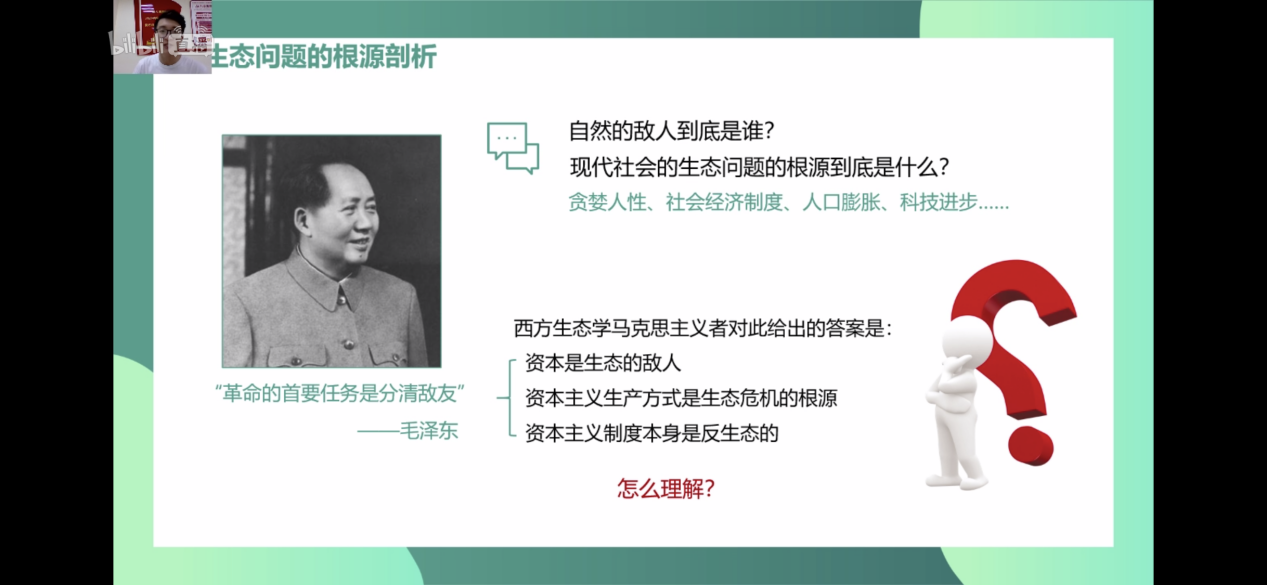意识到生态危机所带来的灾难,就要剖析产生生态危机的真正根源。关于这一问题,同学们线上展开了讨论,给出的答案有:社会经济制度、人口膨胀、科技进步等。陈雷以“自然的敌人:生态问题的根源剖析”为主题从资本的角度带领同学们进行更深一层地探索,以改变哈丁的公共地模型为例引导同学们理解资本对生态的影响。