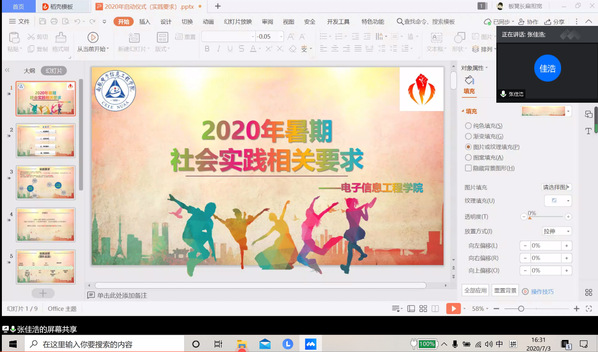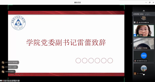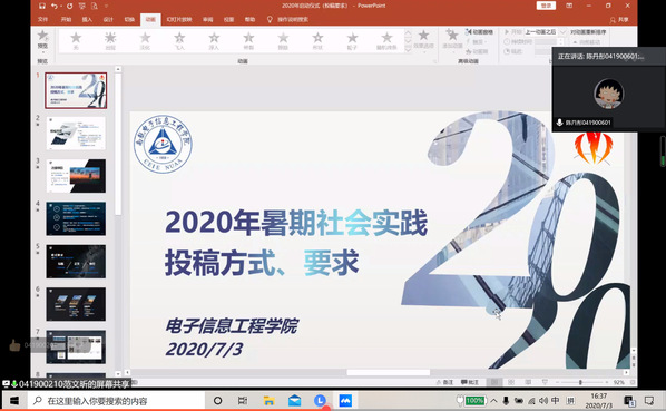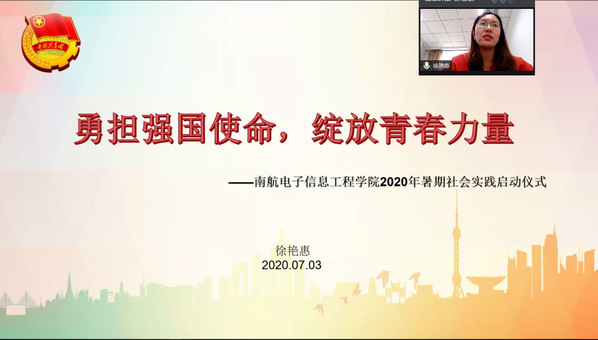 7月3日下午,电子信息工程学院举行了梦想公开课暨2020年暑期社会实践启动仪式,旨在引导同学们了解社会实践的意义和重要性,并为同学们的实践活动提出建议,帮助同学们高质量地完成这一门暑期必修课。学院党委副书记雷蕾,学院团委书记徐艳惠,各年级辅导员老师,往期优秀实践团队的成员及大一大二全体同学参加了此次会议。