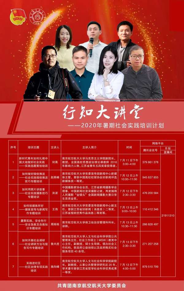 为进一步提升暑期社会实践质量,校团委举办了行知大讲堂系列培训。7月11日-7月13日,校内外7名专家分别开展了关于选题、摄影、社会调研等主题的讲座,为同学们提供全方位指导。