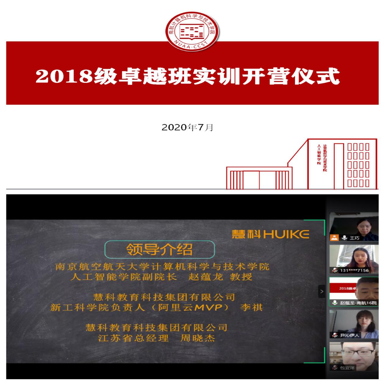 为拓宽学生的视野,提高本科生专业实践能力,进一步提升人才培养质量,计算机学院2018级卓越班企业实习实训于7月20日正式开营。由于今年情况特殊,原本的暑期实训工作也与时俱进,利用线上工具与平台改为了线上实训。计算机学院副院长赵蕴龙和慧科教育科技集团有限公司李祺、周晓杰等5位企业导师代表出席了开营仪式,2018级卓越班全体学生参加了本次活动,仪式由慧科公司大数据分析师EMO王巧老师主持。