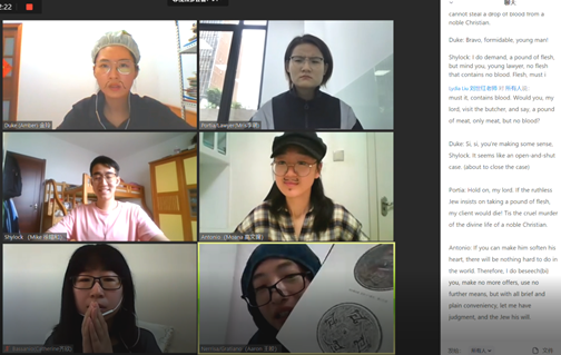 本次夏令营在活动内容、交流形式和结营方式等方面具有创新性。活动内容方面,重点赏析莎翁经典戏剧,并关照疫情现实。莎士比亚曾亲历欧洲大瘟疫,在新冠疫情下重读莎翁戏剧,可加深学生对疫情的认知和反思。其次,夏令营活动交流模式新颖,戏剧赏析、研讨和创意写作相互配合,知识传授和思维训练齐头并进。另外,夏令营注重过程评价和结果导向,提升学生自主学习、团队合作以及创新展演的能力。在活动过程中,四个小组同学在两位教授悉心指导下出色地完成剧情的设计和写作。其中,两个小组以新冠疫情为背景对莎翁戏剧进行创意改编,传播抗疫正能量,赋予了经典文本鲜活的时代生命。