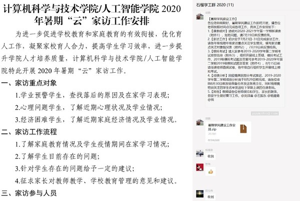 为有效开展大学生思想政治教育工作,拓宽思想政治教育工作途径,深入了解疫情期间学生的学习、生活、身心健康等情况,进一步促进家校教育的有效衔接,发挥家校育人合力,计算机科学与技术学院/人工智能学院自7月初开始,历时一个月先后对近50名学生集中进行了“云”家访。学院院长陈兵、副院长赵蕴龙、党委副书记管祎、专业主任、各班班主任及各年级辅导员参与了本次“云”家访工作。