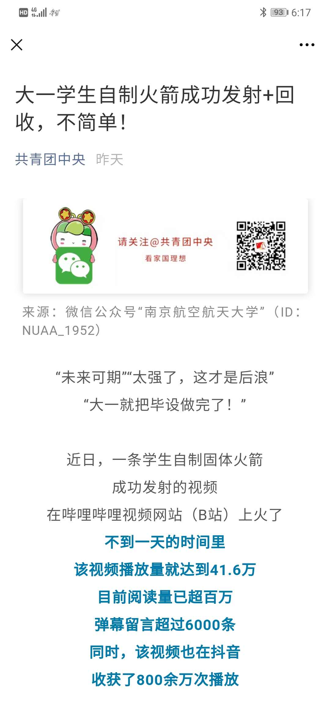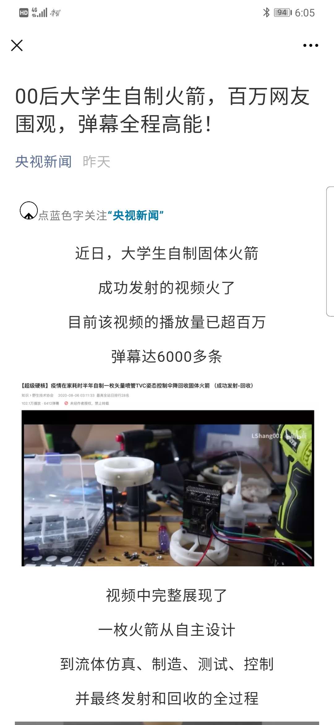 央视新闻:00后大学生自制火箭,百万网友围观,弹幕全程高能!