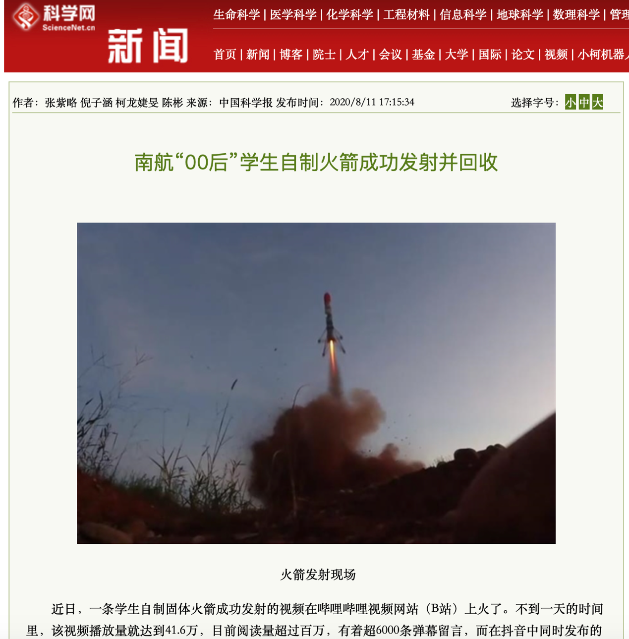 中国科学报:南航“00后”学生自制火箭成功发射并回收