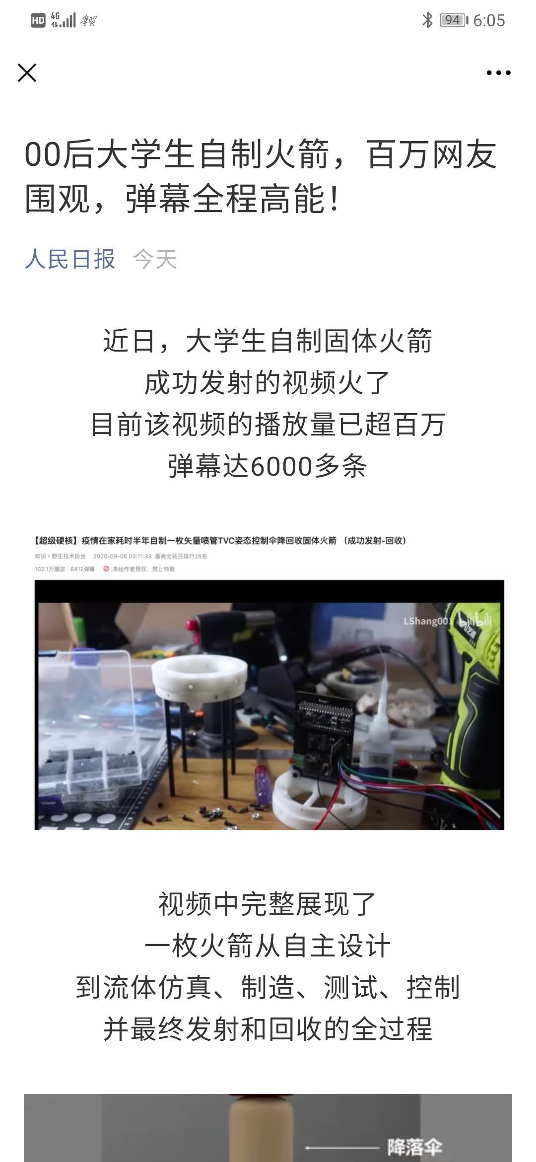 人民日报:00后大学生自制火箭,百万网友围观,弹幕全程高能!