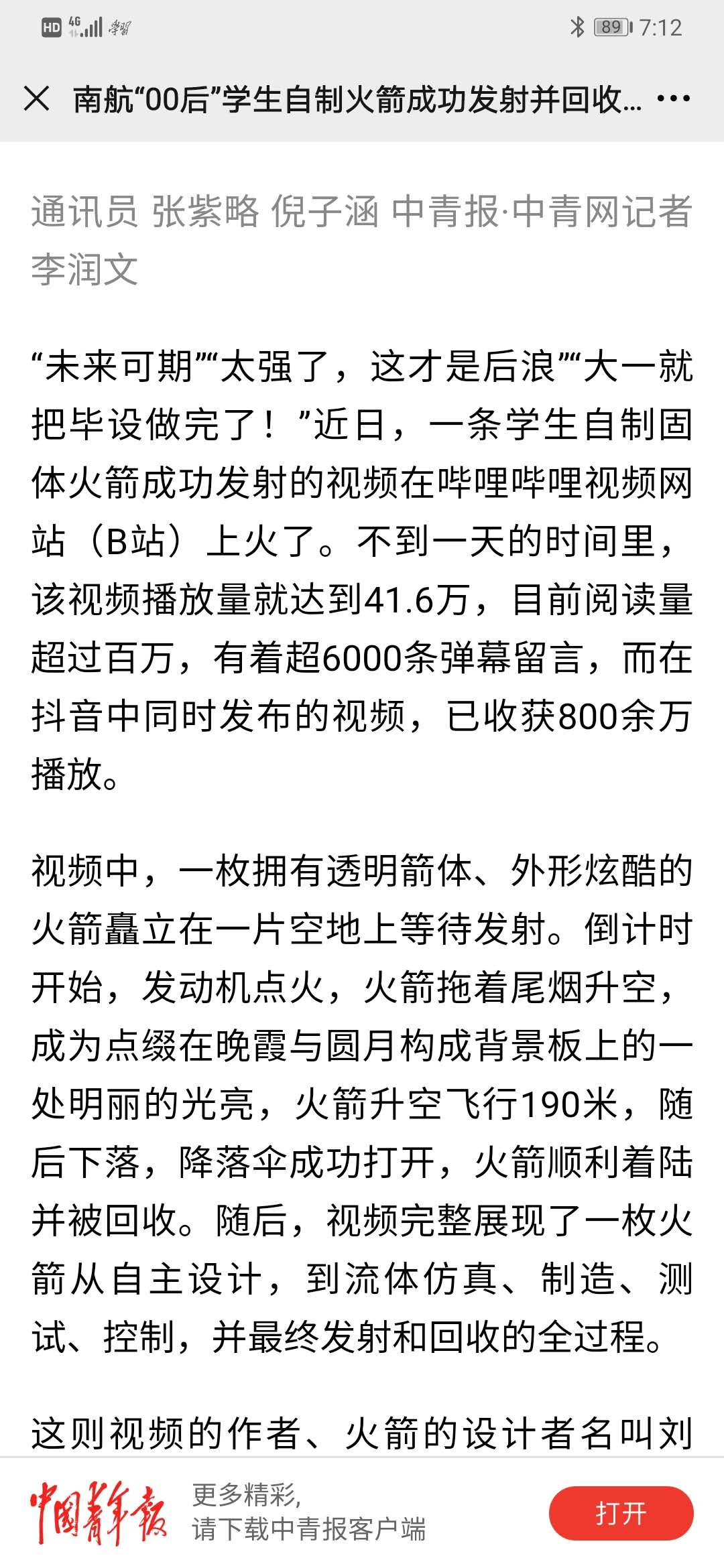 中国青年报:南航“00后”学生自制火箭成功发射并回收 未来想用火箭送快递