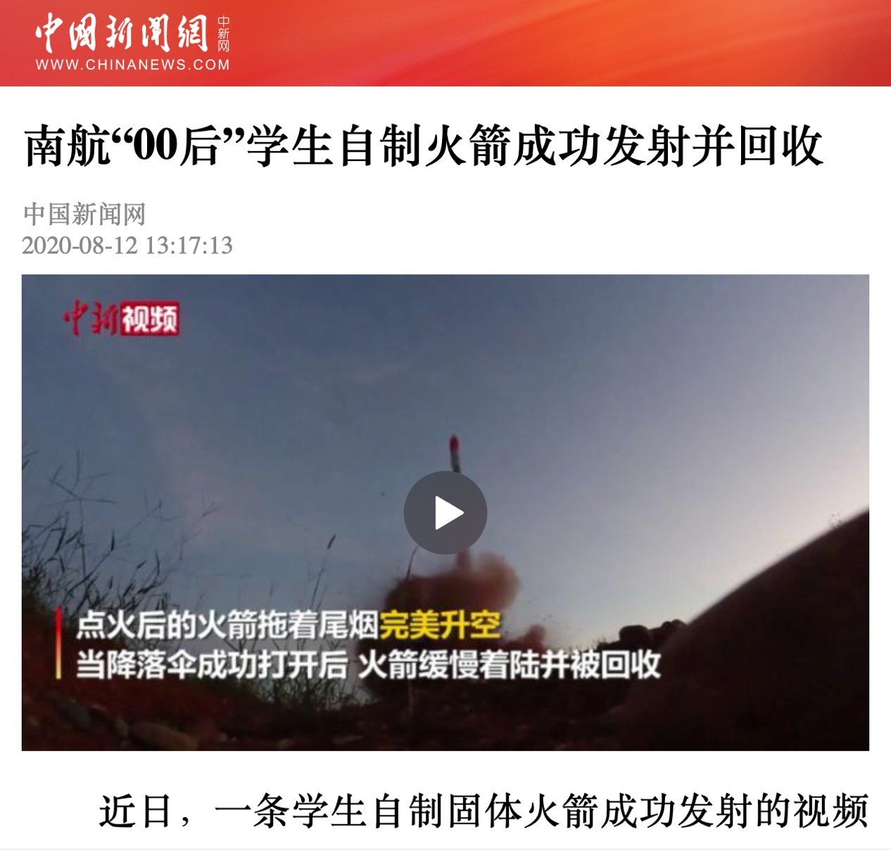 中国新闻网:南航“00后”学生自制火箭成功发射并回收