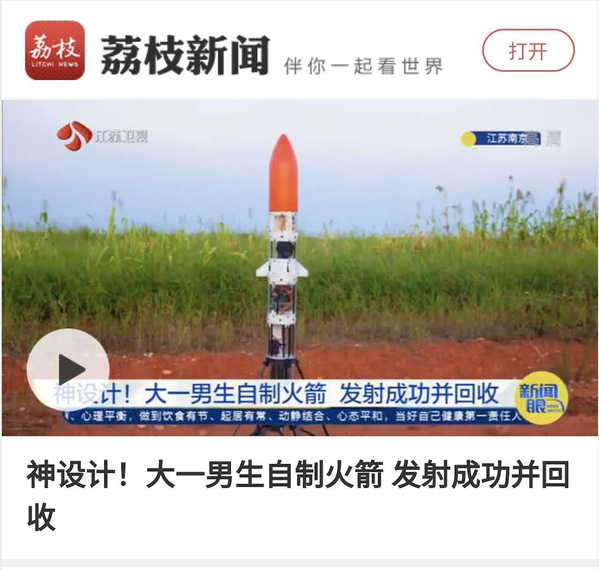 中国新闻社:“后浪”来了!大一学生自制火箭成功发射并回收