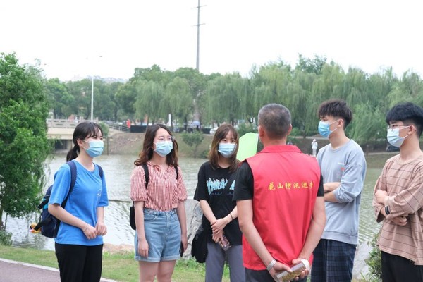 下沿安徽马鞍山,队员深入慈湖河周边,在对街道办郭主任的采访中了解到当地的防汛工作运行机制,即招募周边空闲居民参与防汛工作。据悉,当地防汛人员约480人,24小时轮流巡河,其中还有不少退休老人参与防汛工作。队员们深受其感动与鼓舞。