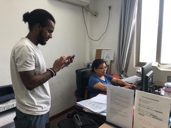 今年的梅雨季节特别漫长,7月20日上午9点半,雨势依旧不减,将军路校区D32栋留学生宿舍楼里,大二辅导员谷雅雯冒着大雨如约而来,她正在和几名来自非洲埃塞俄比亚的学生耐心解释关于宿舍电费缴纳的问题。工作刚满两年的谷雅雯,是留管战线上的一员新兵,是学生们眼中可亲可敬的“小谷姐姐”。小谷姐姐此刻正被学生们团团围住,“嗯,你的电费应该划款到这里”,“离开宿舍一定要记得关空调呀”,“下雨天记得关好门窗,出门要带雨具”,“暑假期间,进出校门要提前申请”…… 谷雅雯耐心地解答着学生的各种问题,时不时跟学生唠叨两句,细密的汗珠从她的鼻尖渗出。“学生们刚来中国没多久,我是他们的辅导员,也是他们在中国的亲人啊。”小谷姐姐忙碌并快乐着。