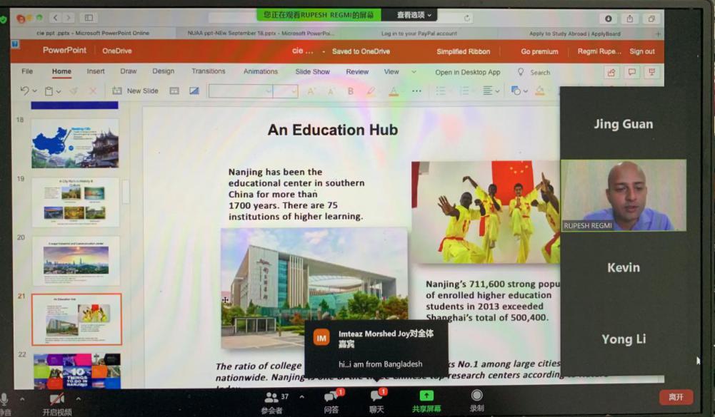 7月12日下午5点,国际教育学院负责留学生招生的查鸿、管婧老师以及两位副院长李勇、陈峰早早等候在学工楼250会议室,为首次以线上直播和在线互动的方式开展的留学生招生说明会做准备。本次招生说明会,面向国外有志报考南航的外国学生,在疫情防控特殊时期,对外宣传南航国际教育办学特色和招生信息;为更好的吸引海外优秀学子来南航学习,提升南航国际影响力,两位副院长亲自为参加本次说明会的外国学生介绍了我校的发展历史、南京概况、在校留学生规模,学科专业特色等;招生老师管婧详细解读我校留学生招生政策、奖学金生录取条件、留学专业设置以及目前中国境内新冠肺炎疫情防控的最新情况。本次说明会特别设置互动答疑环节,观看直播的外国学生与直播宣讲老师开展互动交流,围绕学科专业、发展前景、录取条件等问题积极提问,招生老师详细解答。本次线上直播说明会是外国学生与南航“第一次亲密接触”,国际教育学院全体招生工作人员准备充分,应对自如,给外国学生留下了关于南航美好的第一印象。