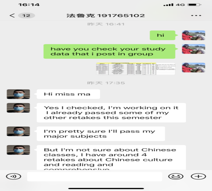 7月22日下午5点半,乌云压城,暴雨将至。大三辅导员马帅正在245办公室给境外留学生打国际长途。考虑到时差问题,马帅特意等到国外学生起床才拨通电话。电话里马帅鼓励留学生做好个人防护,安排好在线学习任务,并期待在美丽校园的再次相会。线上教学期间,为了督促境外学生完成学业,马帅通过各种方式和学生们逐一联系,社交软件、电子邮件、国际长途……总之,不能落下任何一个孩子。暑假期间她逐一梳理学生学习情况,建立了学业警示表、做了详细的谈话记录,并向学生定期公布学分绩点、年级排名等学习数据,督促学生抓紧学业不放松。