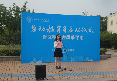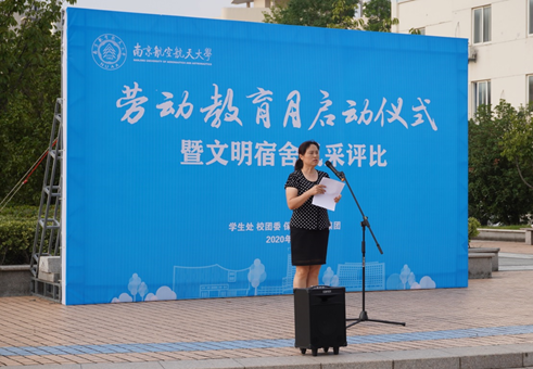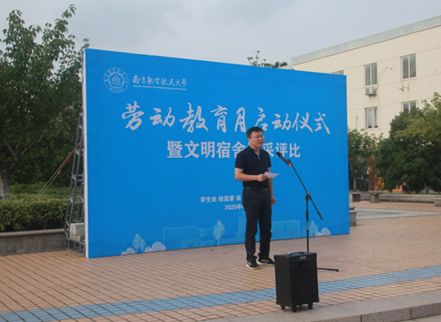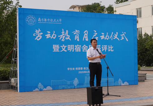 仪式伊始,学生处处长侍旭进行致辞。他指出,在抗击新冠肺炎疫情工作中,我们看到了建筑工人、快递外卖人员、社区值守人员等各行各业的普通劳动者,和医务工作者共同支撑起抗击疫情伟大战役的胜利旗帜,我们要从他们身上学习劳动精神,深植劳动情怀。其次,结合习近平总书记对制止餐饮浪费行为作出的重要指示,要深入推进“光盘行动”,培养学生勤俭节约的良好美德。各学院要积极教育引导学生崇尚劳动、尊重劳动、热爱劳动,培养符合南航气质的德智体美劳全面发展的社会主义建设者和接班人。