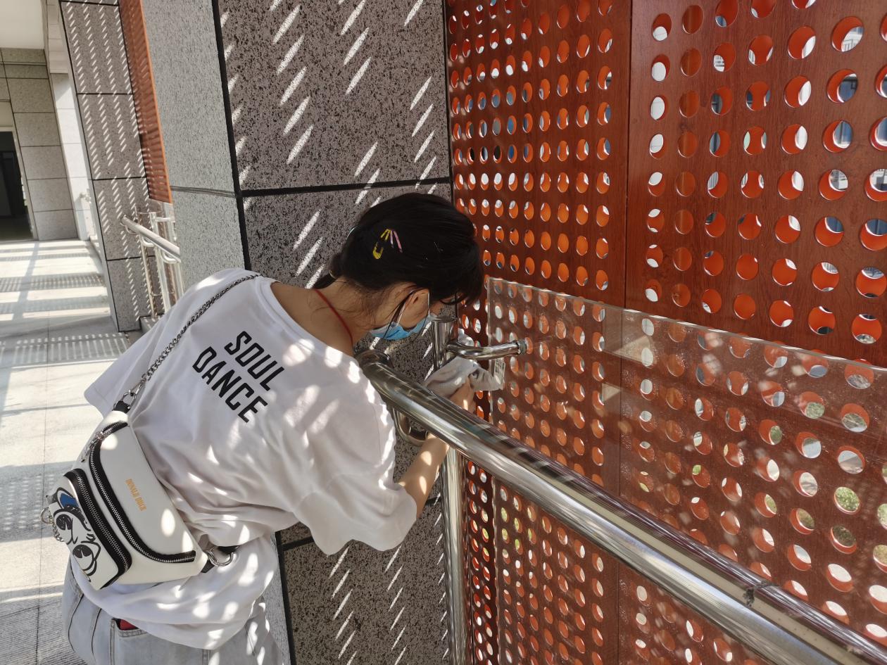 新楼地面的瓷砖上有很多难以去除的顽固污渍,同学们就拿起小铲刀蹲在地上锉,长长的走廊,同学们一路蹲着锉过来,却没有人喊一句“腿麻了”;负责室外走廊的同学们,顶着太阳擦拭两侧的扶手和玻璃,一桶又一桶被抹布洗黑的脏水,换来了焕然一新的阳光长廊;负责卫生间的同学们主动承担起这份工作,利用消毒液将新楼的卫生间冲洗得干干净净。