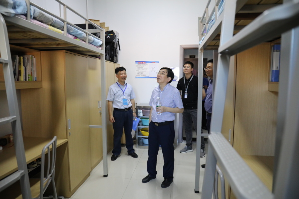 最后,施大宁走进学生宿舍了解学生住宿情况。在看到窗明几净、井然有序的宿舍内务时,施大宁对学院准军事化管理规定给予高度评价。