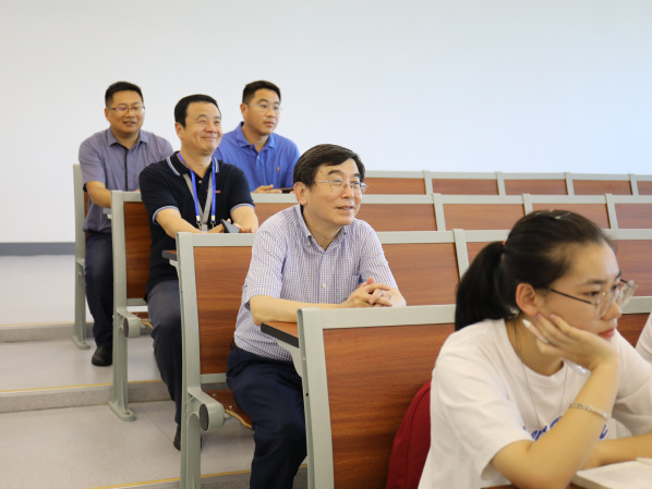 施大宁来到教学楼四楼毛泽东思想与中国特色社会主义理论体系概论课堂时,同学们正在上课,施大宁一行在教室后排坐下,与同学们一道认真听课。