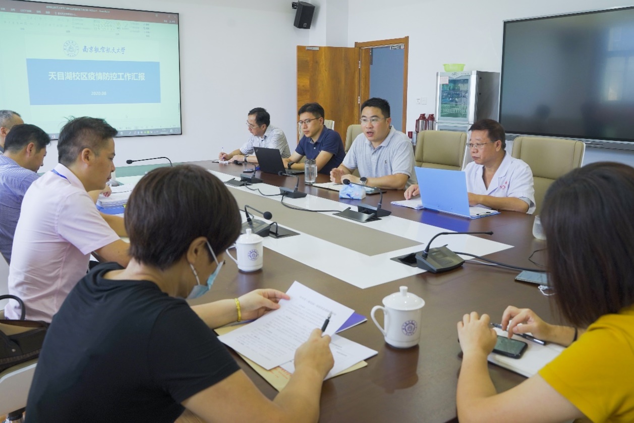 缪长宗向检查组汇报了天目湖校区疫情防控工作总体部署和组织管理情况,并就落实进出校门管控制度、食堂就餐管理、学生健康监测、应急处置等进行了专项汇报。缪长宗表示,南航天目湖校区将严格按照上级部署,以高度的责任心和使命感切实抓好疫情防控工作常态化,安全有序推动校区开学复课,全力保障校区师生卫生安全。