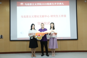 在赠书环节,与会领导向新生代表赠送《马克思恩格斯选集》四卷和《习近平谈治国理政》三卷,希望同学们能进一步加强研究中对经典原著的运用,着力提升马克思主义理论研究的学术涵养、铸就信仰根基。