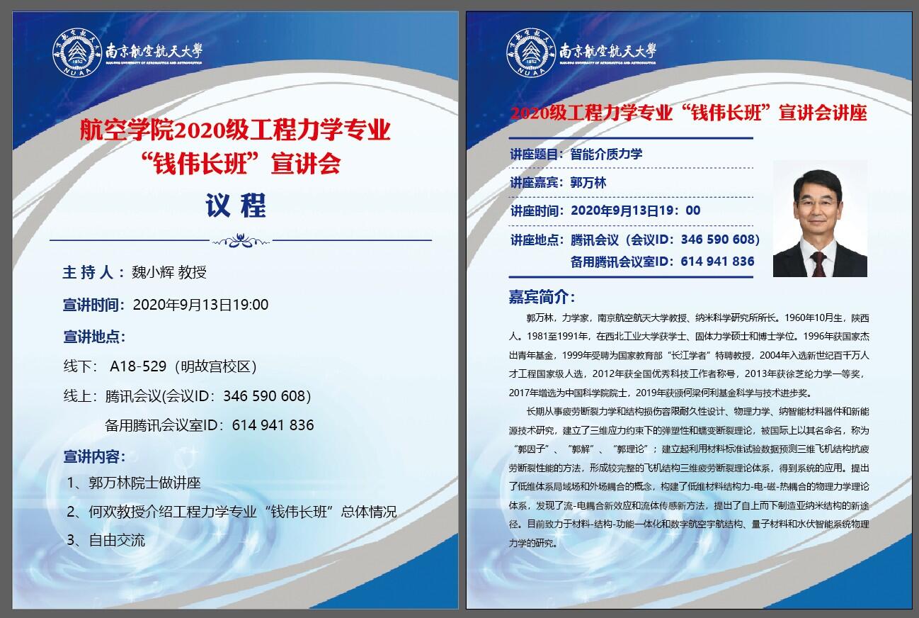 航空学院2020级工程力学专业“钱伟长班”选拔宣讲会于9月13日晚在明故宫校区A18-529教室和腾讯会议平台,线下线上同步进行宣讲。本次宣讲会由航空学院副院长魏小辉教授主持,纳米科学研究所所长郭万林院士、院长助理陆洋教授、振动工程研究所所长何欢教授出席了本次会议。
