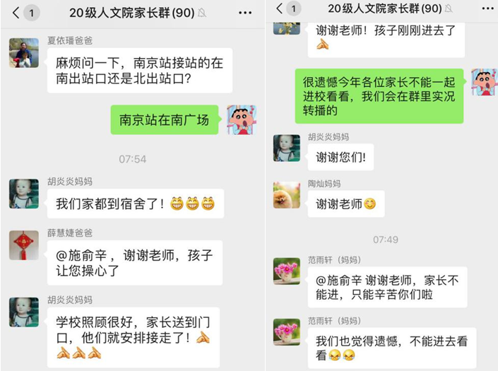 在常态化抗疫的特殊时期,今年的新生报到日,家长们只能把孩子送到学校门口,心里难免有些许遗憾。但贴心的迎新志愿者们早已在各个校区入口做好了充足的准备,为新生入学保驾护航。志愿者为每一个加入人文学院大家庭的新同学介绍校园、搬运行李,关心照顾,无微不至。家长们纷纷表示,学校和学院的每一个举措都蕴含着暖暖的真情。