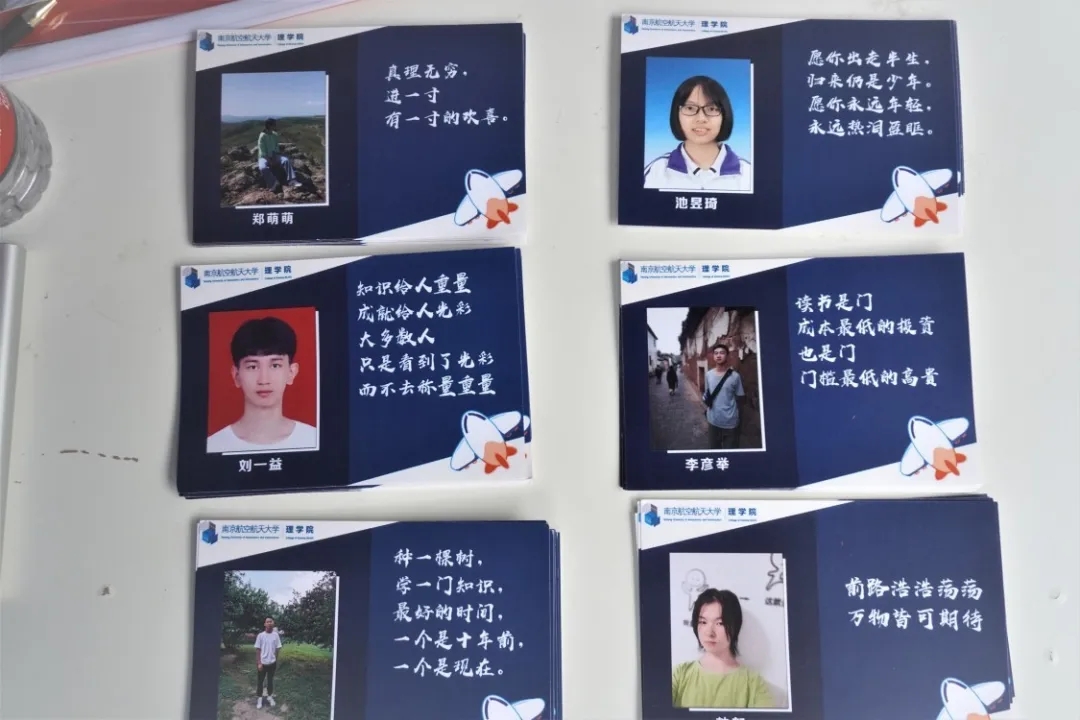 “逐梦云天,‘理’应有你”迎新墙上由所有本科新生姓名组成的院徽,象征着新生凝聚在理学院这个大家庭,每个人都是不可缺少的一员,同学们纷纷找到自己的名字并合影打卡,留下来到南航的最初“印记”。“礼遇·理预”的民族风情迎新墙上用来自18个新生少数民族的民族语言写下了“欢迎你,新同学”,亲切迎新生,增强新生归属感。学院还为每位新生定制了“理学大师寄语”专属明信片,正面是大师寄语,背面由新生写下自己对大学的期待,并投入到“时光机”里,希望在未来能遇见更好的自己。高年级学长学姐给新生们留下了饱含热情和期许的一封封信,希望他们在大学能够以梦为马,不负韶华。