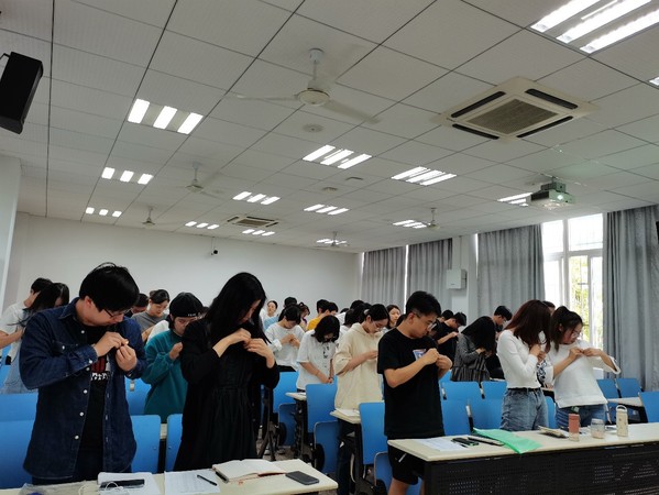 在共同佩戴党徽环节,全体党员起立并庄重地给自己佩戴好党徽,这不仅仅是一个简单的佩戴动作,也意味着他们从今天开始正式成为了民航学院硕士20级联合党支部的一员。