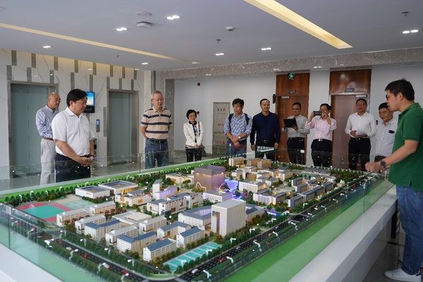 殷凯在综合服务楼的沙盘处介绍了天目湖校区的规划建设概况。