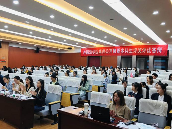 为全面贯彻落实党和国家的教育方针,积极推进我校“培养具有责任意识、创新精神、国际视野、人文情怀的社会栋梁和工程英才”的人才培养目标,外国语学院于10月14日晚在学院国际会议中心开展素养公开课暨本科生评优评奖答辩。外国语学院副院长徐以中、党委副书记梁薇、团委书记关天茹、英语系系主任张立新、日语系系主任窦硕华、本科生辅导员彭欢、盛嘉贤及两名本科生新生代表担任评委。公开课由2020级日语专业新生王思捷主持,学院本科生到场观摩学习。