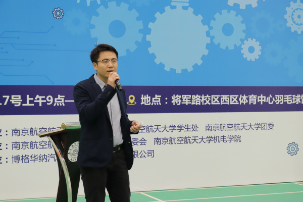 开幕式上,博格华纳制造生产部王明明经理致辞。他介绍了博格华纳公司的基本情况,并对与南航一直以来校企合作表示感谢。他表示,智能机器人是未来最全面、最具潜力的发展领域,希望更多南航学子在实践中施展才华,锻炼创新设计能力、知识运用能力、工程实践能力和团队合作能力。