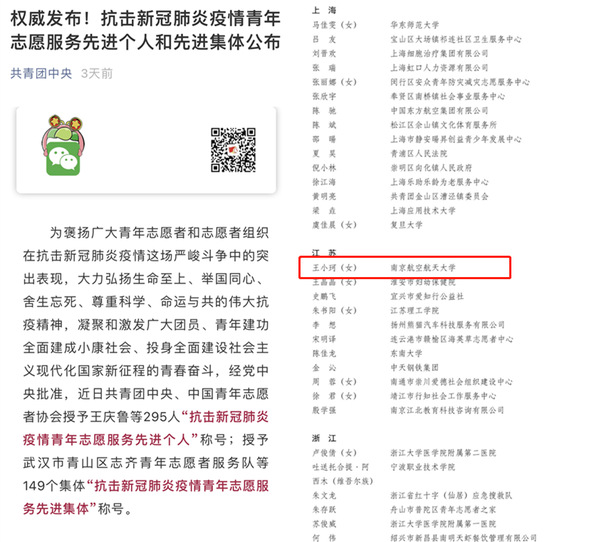 近日,为褒扬广大青年志愿者和志愿者组织在抗击新冠肺炎疫情这场严峻斗争中的突出表现,经党中央批准,共青团中央、中国青年志愿者协会授予295人“抗击新冠肺炎疫情青年志愿服务先进个人”称号,授予149个集体“抗击新冠肺炎疫情青年志愿服务先进集体”称号。我校经济与管理学院王小珂同学荣获“抗击新冠肺炎疫情青年志愿服务先进个人”称号。