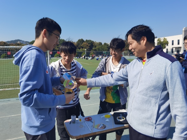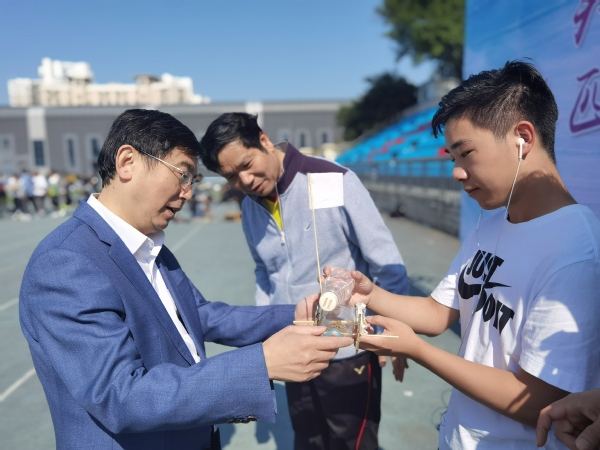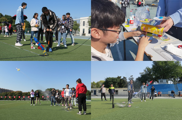 前期,在赛事宣传、组织报名的基础上,大学生科协组织开展了线上线下相结合的专项培训和水火箭发射测试。比赛现场,所有参赛队伍统一配备胶水、木条木板和橡皮筋等材料,自备各类非动力材料,进行两小时现场创意设计与制作。各参赛队伍的设计思路均不相同,有的用塑料瓶自制风扇“喷气”推进,有的用光盘做轮稳定前行,有的水火箭可以在触地之前水漂机动继续滑行。经过比拼,橡皮筋小车最远行驶距离14.9米,水火箭最远发射距离91.9米,当参赛团队取得一个又一个好成绩时,现场欢呼声络绎不绝。