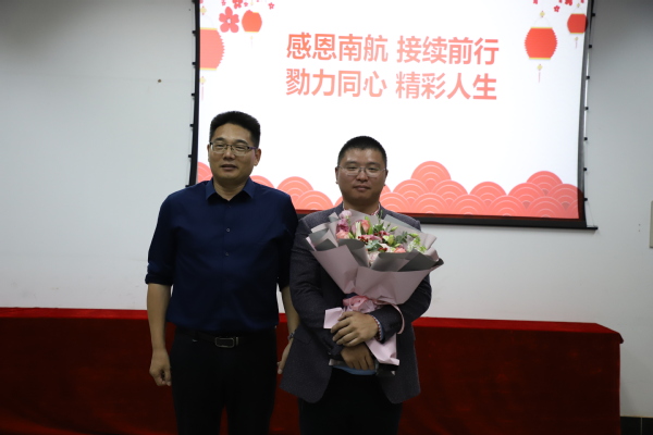 首先为唐海云举行荣休仪式,对她在南航兢兢业业、勤勤垦恳、不计名利、坚守岗位的精神表示敬意与感谢。袁贵平为唐海云老师赠送纪念品,新教师代表厉余浩为唐海云献花。