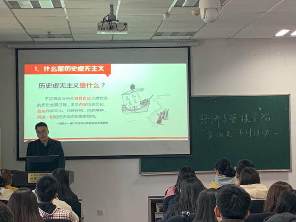 为深入贯彻落实习近平总书记在纪念中国人民志愿军抗美援朝出国作战70周年大会上的讲话精神,弘扬伟大的抗美援朝精神,增强青年学生群体的民族自豪感和历史使命感,经济与管理学院举办了“学四史”系列活动第二期——“历史虚无主义虚无了什么?”主题党课,学院2019级本科生辅导员康冲主讲本次党课。