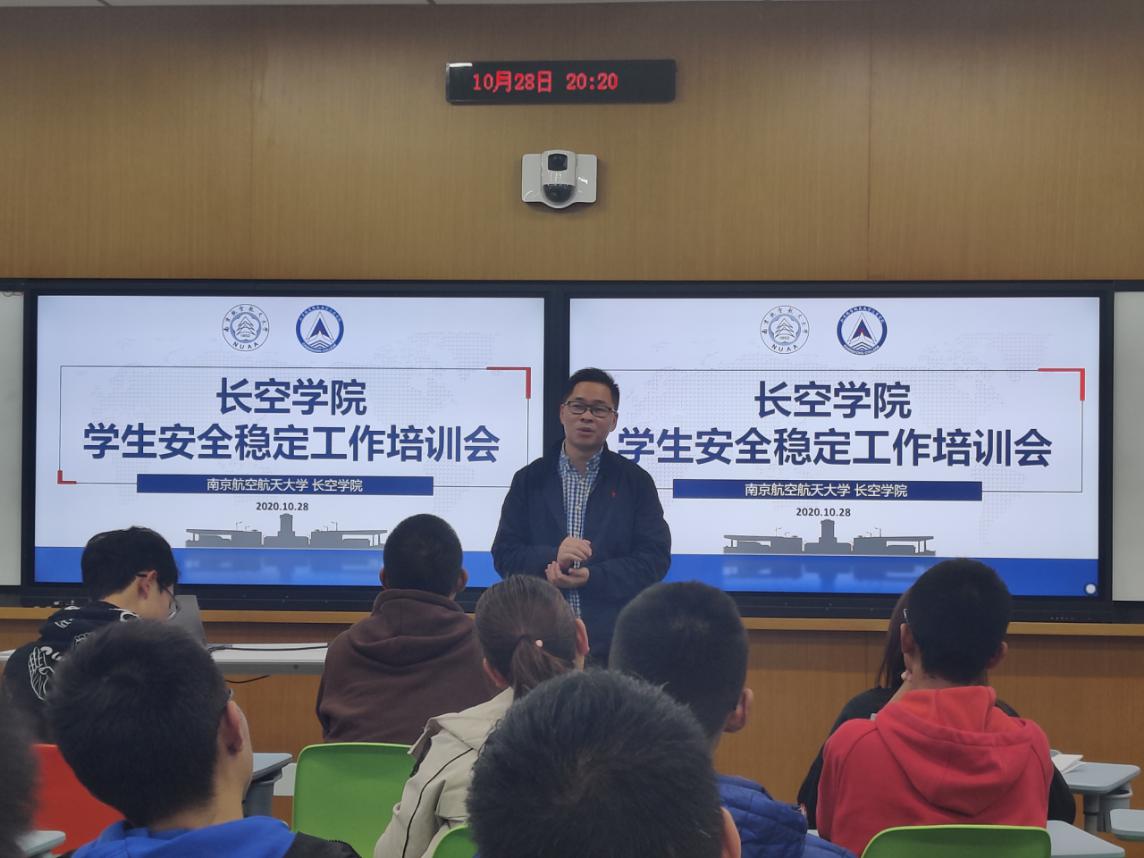 10月28日晚,为进一步提高学生安全防范意识和自我保护能力,长空学院召开安全稳定工作培训会,特邀校保卫处治安管理科科长周栋栋作专题辅导,学院副院长张林、全体辅导员、大一大二年级班级学生骨干参加培训会。