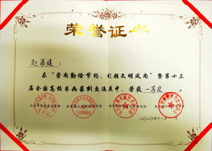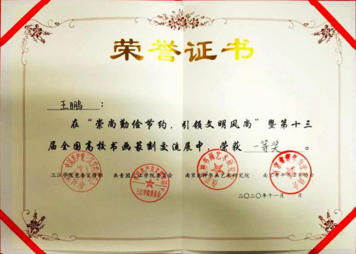 2020年11月4日,第十三届全国高校书画篆刻交流展在三江学院图书馆开展。此次展览,由共青团三江学院委员会主办,三江学院书画协会承办,驻宁高校书画协会联盟、三江学院党委宣传部、三江学院图书馆协办,由南京龙神书画艺术研究院和南京青年书法家协会为支持单位,展览时间为11月4日—11月10日。开展当日,汇聚了全国七省38所高校的作品,包括书法作品88副及绘画作品近百副,得到了龙神书画艺术研究院、中国书法家园网、南京市青年书法家协会以及南京林业大学、南京信息工程大学、长春建筑学院、东北大学、河北地质大学、阜阳师范大学、重庆师范大学、南京财经大学、南京航空航天大学、南京师范大学、南京邮电大学等单位和高校支持,经过评委老师现场评审和打分,我校艺术学院邱世鸿教授的两名研究生王鹏、赵锡媛,均荣获一等奖。