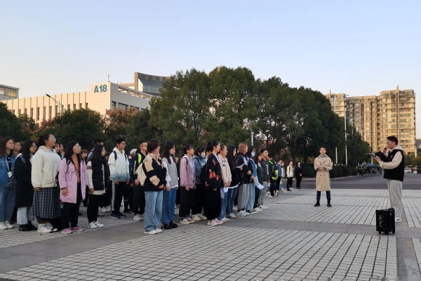 七点整,英姿飒爽的国旗班护卫队队员整齐划一的脚步声响彻国旗广场。三位护旗手护送国旗,齐踏矫健步伐到旗台上。全体新生肃立,目光落在国旗上,雄壮有力的国歌——《义勇军进行曲》响起,升旗仪式开始。鲜艳的五星红旗伴随庄严的国歌,在旗手的拉动下徐徐上升。
