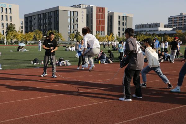 十人八字跳长绳项目更加紧张刺激,每位参赛同学衔接紧密、精神高度集中,团结与默契不断把气氛推向高潮。