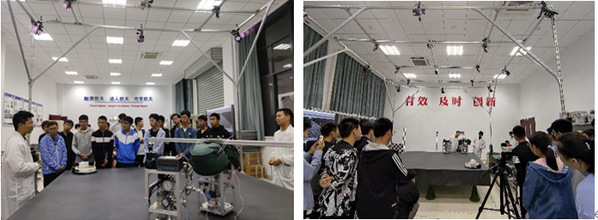 研究生陶新勇、胡苗苗讲解了平面气浮平台卫星仿真系统的工作原理作用,还让大家上场体验了动捕系统如何“捕捉”自己的位置和姿态。