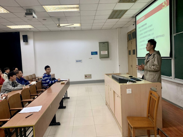 大会在庄严的国歌声中拉开序幕,本次支部大会分两个议题。首先,于子洋分别对申请入党条件、入党流程、资料审核等党员发展要求进行了详细的讲解,进而对“三会一课”、主题党日活动、组织生活会、民主评议党员等党组织生活方面进行了介绍。同时对入党积极分子和发展对象提出了殷切希望,他指出同学们应牢记为人民服务的宗旨,树立为同学们服务的意识,从点滴小事做起,积极起到模范带头作用,并鼓励同学们勇敢展现自己,继续努力。